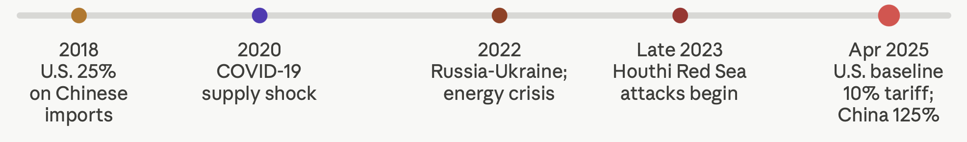 The first serious stress test came with COVID-19 in 2020, which revealed that a global supply chain optimised to a 3% margin of error had no tolerance for a 30% demand shock. The Russia-Ukraine war, Brexit, and intensifying U.S.-China trade tensions prompted observers to characterise the current era as a "new Cold War," with disruptions now stemming simultaneously from supply-side and demand-side shocks.