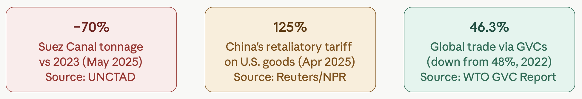 By May 2025, tonnage through the Suez Canal sat 70% below 2023 levels. Simultaneously, the Strait of Hormuz through which 11% of global trade and a third of seaborne oil transit, faced renewed disruption risks, and freight rate volatility was described by UNCTAD as "the new normal."