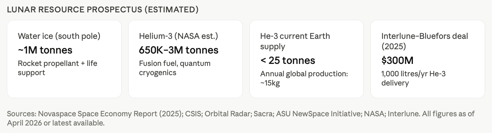Humanity has not landed on the Moon in 54 years. The hardware required to do so under Artemis specifically Starship's performance as a lunar lander, has not yet demonstrated full orbital capability. China has never conducted a crewed spaceflight beyond low Earth orbit. Lunar helium-3 extraction remains, at present, a prototype excavator and a series of forward purchase agreements. The resource estimates for water ice and helium-3 are based on orbital spectroscopy and Apollo-era sample analysis, not the direct subsurface characterization that commercial extraction would actually require.