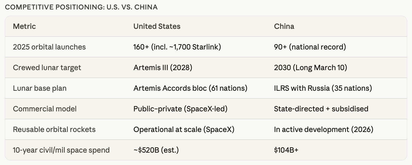 The shakeout this triggers in the rest of the industry is already visible. Launch competitors like Rocket Lab, United Launch Alliance, and Europe's Ariane 6 do not compete with SpaceX on price, they exist primarily to provide sovereign industrial redundancy. In China, 2026 has been declared the "Year of Commercial Space," with breakthroughs in reusable rocket technology expected to push the industry from a policy incubation phase to large-scale implementation, and Landspace becoming China's first commercial space stock on the A-shares Science and Technology Innovation Board. This is not China catching up. This is China building its own operating system.