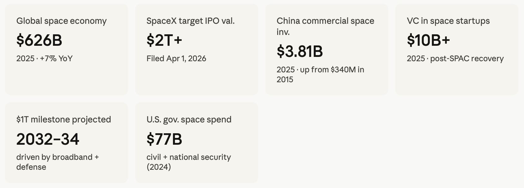 SpaceX confidentially filed for an IPO with the SEC on April 1, targeting a valuation above $2 trillion, which, if achieved, would make it the largest public offering in history and crystallize a profound structural shift in the space economy: the United States is running its great-power competition through private balance sheets, not government budgets alone.