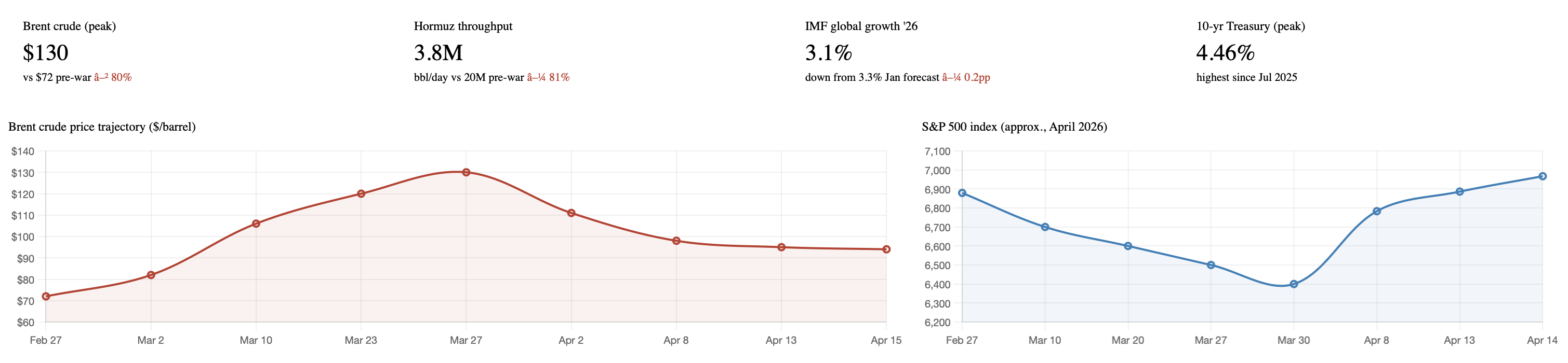 This article draws on data available as of market close April 14, 2026. Oil price figures cited reflect Brent crude futures and physical spot-market prices as reported by the IEA monthly report released April 14, 2026. IMF growth and inflation forecasts are drawn from the April 14, 2026 World Economic Outlook. S&P 500 and DJIA closing figures are sourced from CNBC and Motley Fool market data reports. Any material inaccuracies should be reported to the editorial desk.